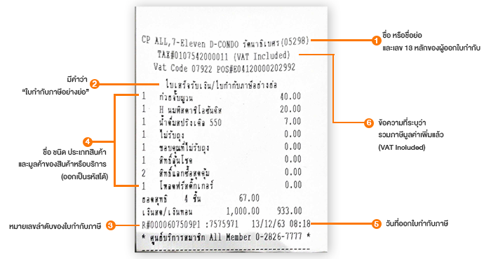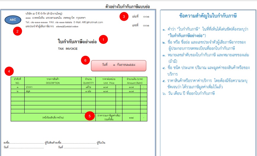 - คำว่า “ใบกำกับภาษีอย่างย่อ” ในที่ที่เห็นได้เด่นชัด (ต้องระบุว่า “ใบกำกับภาษี อย่างย่อ”)