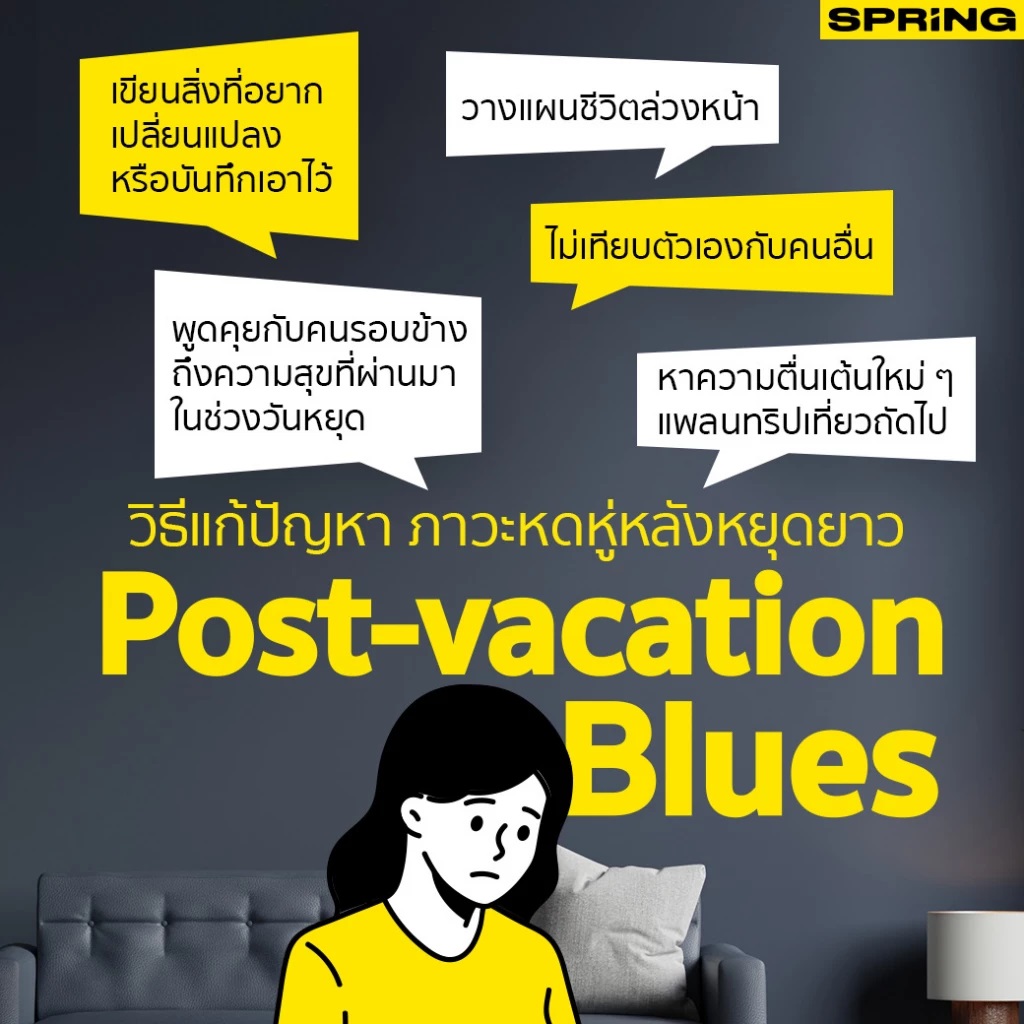 หลังจากหยุดกันยาวๆ อย่างชื่นช่ำสบายอุรามานั้น คุณก็มาพบว่าวันรุ่งขึ้น ต้องมาทำงาน !! โอ้ไม่นะ!? นี่ฉันต้องไปทำงานแล้วหรือนี่ แล้วเราจะพบว่าหลายคนจะมีอาการมากมาย รู้สึกว่าไม่อยากไปทำงาน รู้สึกเบื่อหน่าย ไม่อยากพบปะ ไม่อยากพูดคุย ไม่อยากเจอะเจอมรสุมแห่งวิถีการทำงาน ฯลฯ ในทางจิตเวช เรียกอาการนี้ว่า Post-vacation Blues เรามาดูกันสิว่าเราจะมีเคล็ดลับอย่างไรที่จะแก้ไขปัญหาต่างๆเหล่านี้ เพื่อให้คุณกลับมามีไฟและพร้อมจะลุยต่อ